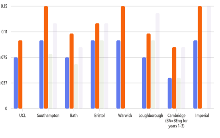 UniversityMechanical BEngMechanical MEngAerospace/Aeronautics BEngAerospace/Aeronautics MEngUCL6–9%8–12%——Southampton8–12%12–18%6–10%10–15%Bath6–9%9–13%5–8%7–11%Bristol8–12%10–15%8–12%10–15%Warwick8–12%12–18%——Loughborough6–9%9–13%8–12%12–16%Cambridge (BA≈BEng for years 1–3)3–6%6–12%3–6%6–12%Imperial8–12%12–18%—12–18%