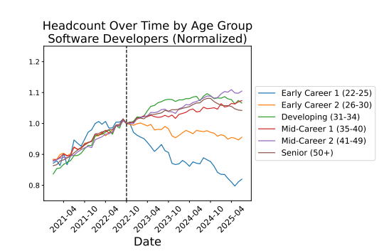 A paper [4] by researchers at Stanford University, helpfully titled ‘Canaries in the coal mine’, studied payroll data of 50 million workers in the US. The study found that employees aged 22-25 in AI-exposed occupations were 13% more likely to lose their jobs than others in less-exposed jobs. As I explored in my previous blog, entry-level software engineering jobs, which involve component-level programming, debugging, testing and documentation, can easily be replaced by generative AI tools such as coding copilots. The study attributed much of this job loss to areas where AI can automate work (i.e. replace a human worker), rather than augment (i.e. help a human worker) the work. In an op-ed in the New York Times, the Chief Economic Opportunity Officer (what a job title!) at LinkedIn describes [5] how the bottom rungs of the career ladder are disappearing. Outside tech jobs, legal firms, consultancy companies, retailers and so on are all now looking towards AI to take on duties once carried out by entry-level roles.
