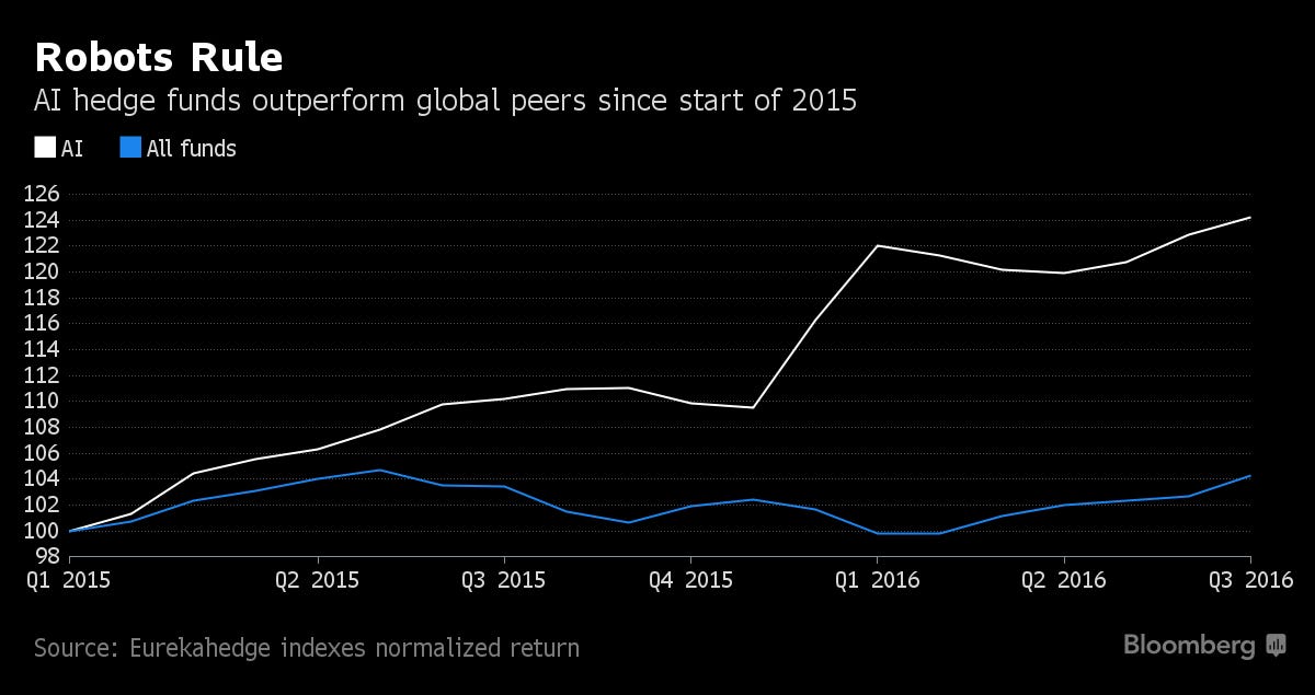 This technology is rapidly being adopted by hedge funds across the world. Bloomberg reports on a Japanese hedge fund manager whose self-learning algorithm anticipated the impact of the Brexit vote on Japanese share prices, resulting in the best single-day gains that year. This company is not alone, as reports from Eurekahedge indicate that AI hedge funds are outperforming other funds.