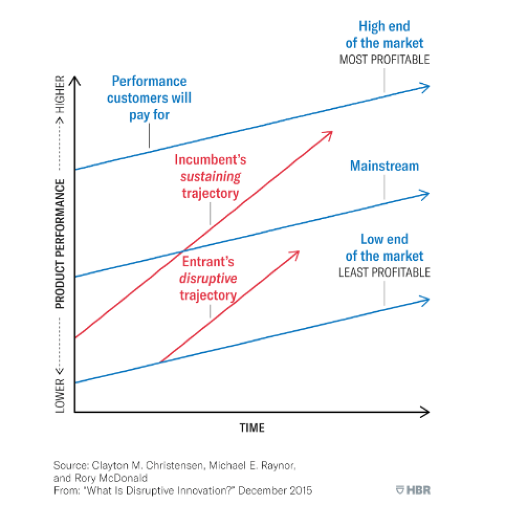 The theory of disruptive innovation was introduced by Clayton Christensen in 1995 [6]. In the seminal book, The Innovator’s Dilemma, Christensen showed how disruptive innovations often start addressing problems in less valuable market segments that are ignored by incumbents. They do however benefit from steeper performance improvement curves than existing technologies, meaning that they sooner or later disrupt the business model of existing mainstream products. A classic example of disruptive innovation was Netflix’s launch in 1997 as a niche mail-order DVD service targeting niche under-served segments – movie buffs and online shoppers.