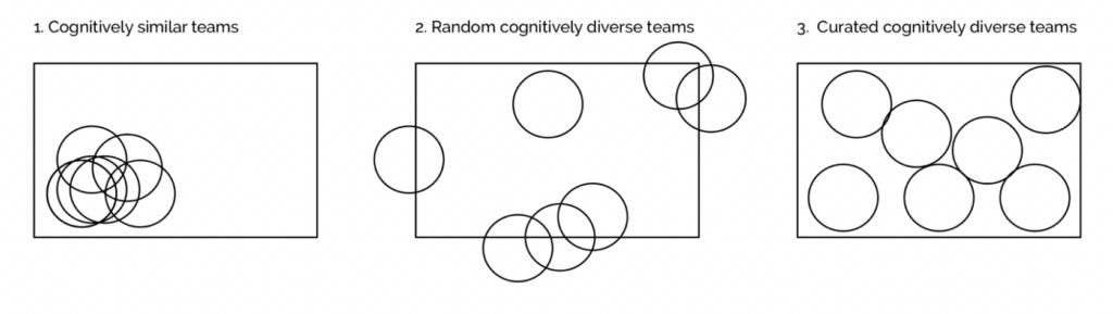 Syed illustrates the importance of cognitive diversity very effectively by representing a problem space as a rectangle, and the perspective of an intelligent individual team member as a circle within it. Cognitively-similar teams consist of a clustering of people with the same perspective and problem-solving space. This means that this team of ‘clones’ has an unconscious predisposition towards a single way of solving problems, and consequently significant blind spots. Such teams are prone to reinforcing the same perspectives and mirroring prejudices. These are exactly the conditions that lead to GroupThink, a topic I explored in a previous post.