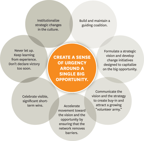 The key insight provided by Kotter, is that as companies grow (or as the jargon goes, ‘scale’), the very mechanisms put in place to coordinate the growing organisation prevent it to flex or change. Kotter therefore advocates that the company maintains a start-up like structure reporting to the CEO or executive board. While I have not seen many examples of this kind of permanent dual organisation, the principle remains valid. For a change strategy to have credibility, it must be seen as an equal to the mainstream business. Too many businesses keep their innovation arms subservient to today’s cash-cows to be successful. Tomorrow’s stars are under-invested in for fear of killing off the cash cow, until the point arrives at which disruptive competitors kill your cash cow. I have seen this at close range where the formally high-margin text messaging service offered by mobile operators remains essentially the same service created in the ’90s, completely superseded by a fantastic diversity of messaging apps.