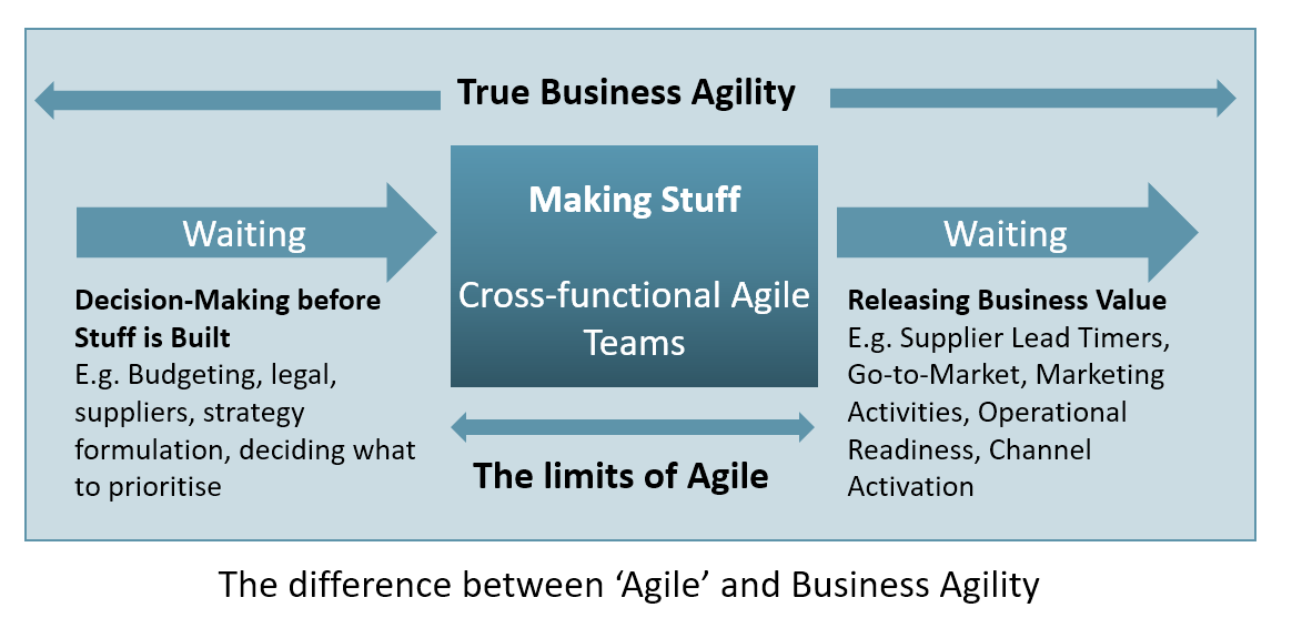 Having defined the boundaries of the Agile organisation, attention should then shift to all the other functions and operations to identify what is causing waiting times. Typically, these will include annual and quarterly budgeting cycles, procurement and legal processes, marketing and go-to-market strategies, supplier lead times and so on. The key point is that if lead times in all the ‘non-agile’ parts of the business are not addressed, it is irrelevant how efficient or nimble your scaled agile implementation is. You would have simply optimised a sub-system and had minimal impact on the system as a whole.