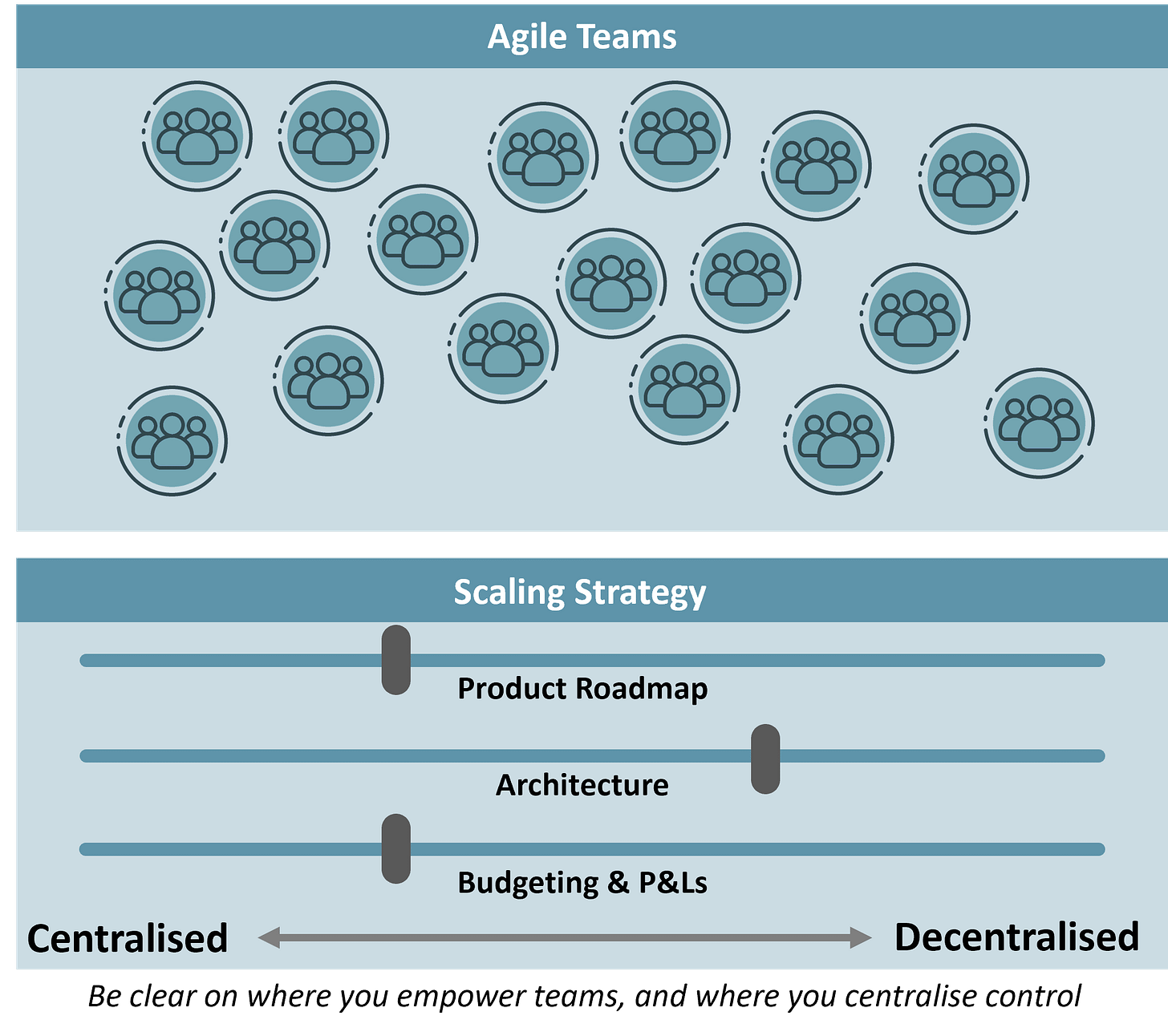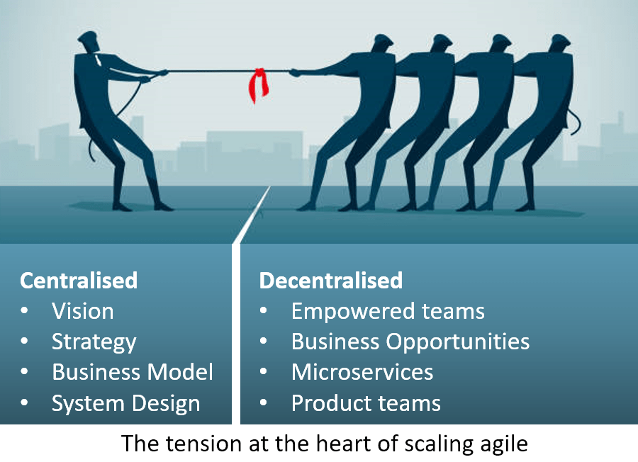 As mentioned above, one of the principal sources of tension in any agile transformation is that between the centralising and control bias of most leaders and the decentralised, self-empowered ethos that underpins agile. Depending on the nature of your business, you may wish to confer different extents of ownership and accountability to your agile teams on areas such as your feature roadmap, your architectural design, your go-to-market strategy, budget ownership etc. There are often good and valid reasons why certain decisions need to be taken away from the agile teams. Being clear and honest about these can help reduce tensions within your teams. The levels of decentralisation that are appropriate for a Software-as-a-Service company built on scalable and decoupled cloud technology will be very different to achieve in a safety-critical, highly co-dependent aerospace company.