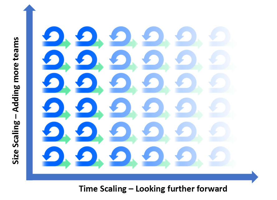 SAFe makes use of bottom-up team-based planning over multiple sprints, a period called a Programme Increment, which in most implementations takes place over a three months’ period. SAFe proposes that the teams make commitments over the current Programme Increment and predictions or forecasts over the following 2 or 3 quarters, thereby providing business leaders with a view of what can be possibly achieved and committed to over a 1-2 year horizon. While this is just how SAFe addresses this topic, most scaling approaches propose some means for planning over significantly longer intervals than individual iterations or sprints.