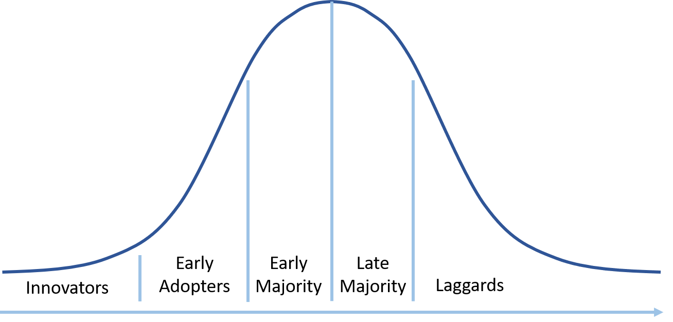 However, in my opinion, the change curve, while useful, is not enough. Unlike dealing with grief, transformation programmes are collective experiences, and each individual will have a different predisposition to accepting, or indeed, embracing the change. One model that has served me well is to adapt the technology/product adoption curve. This, also known as the product diffusion model, or the adoption bell curve will be familiar to most managers and leaders in the tech space. This model was first introduced by Everett M Rogers and popularised in Geoffrey Moore’s Crossing the Chasm. It describes how new discontinuous (i.e. significantly different) consumer products or technologies are taken up by different customer segments.
