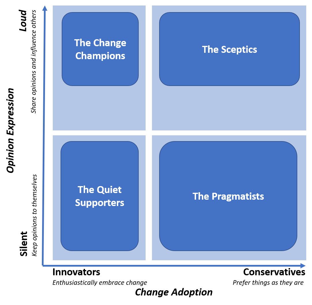 Mapping the Change Adoption Curve and the Opinion Expression Curve together gives a 2×2 matrix beloved of management consultancies. This can act as a guide on how to drive change in your organisation